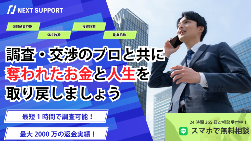 被害に遭いパニック状態で、誰に何を話せばいいのか分からない状況でした。ネクストサポートの担当の方が非常に親切で、私の話を遮らずに聞いてくれ、返金請求のプロセスを一つ一つ、噛み砕いて丁寧に説明してくれたおかげで、冷静に対処できました。精神的なケアも重視してくれる姿勢が本当にありがたかったです。調査の流れが不安な方や、親身な対応を求める方には特におすすめしたい会社です。