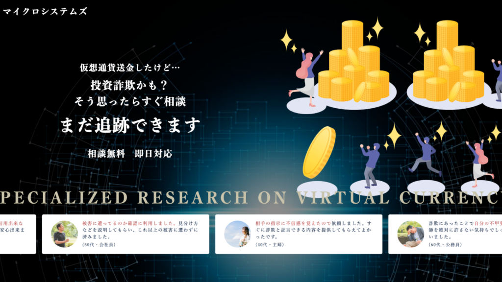 仮想通貨・暗号資産詐欺の返金支援に特化しており、主にデジタル上の資金追跡と証拠収集を専門としています。